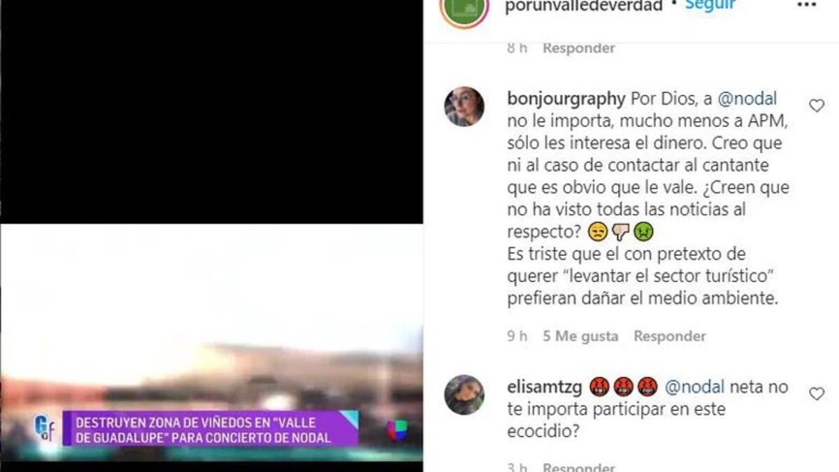 “A Nodal no le importa, mucho menos a APM, sólo les interesa el dinero. Creo que ni al caso de contactar al cantante, que es obvio que les vale, ¿creen que no han visto las noticias al respecto?. Es triste que con el pretexto de querer ‘levantar el sector turístico’ prefieren dañar el medio ambiente”. Comentarios como este se pueden leer en la página de Instagram de “Por un valle de verdad”.