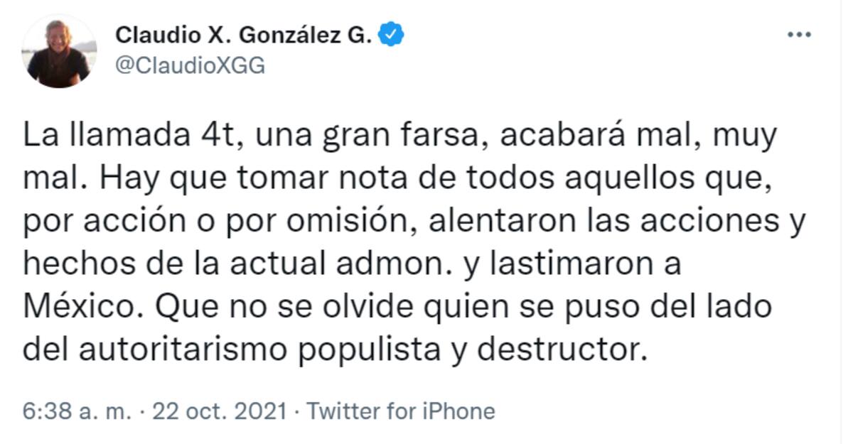 "La llamada 4t, una gran farsa, acabará mal, muy mal. Hay que tomar nota de todos aquellos que, por acción o por omisión, alentaron las acciones y hechos de la actual admon. y lastimaron a México. Que no se olvide quien se puso del lado del autoritarismo populista y destructor", dijo el empresario.