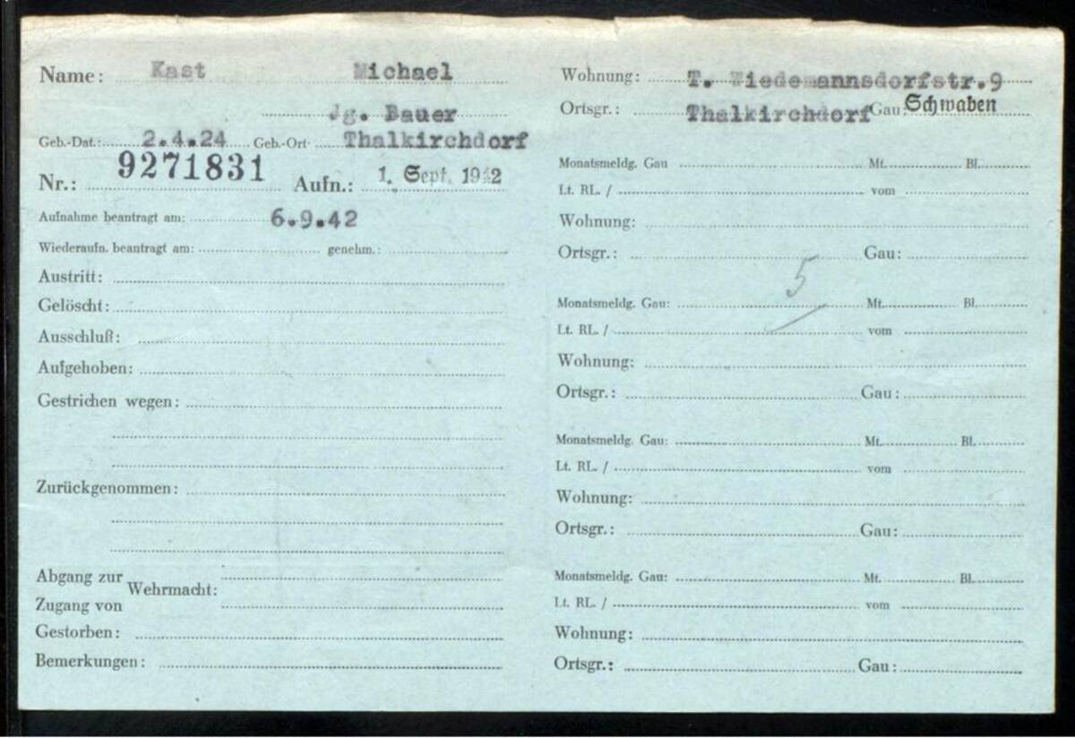 Funcionarios alemanes confirmaron esta semana que una cédula de identidad en el Archivo Federal de Alemania revela que Michael Kast, de 18 años, se afilió al Partido Nacionalsocialista de los Obreros Alemanes (NSDAP por sus siglas en alemán) el 1 de septiembre de 1942, en el apogeo de la guerra de Hitler contra la Unión Soviética.