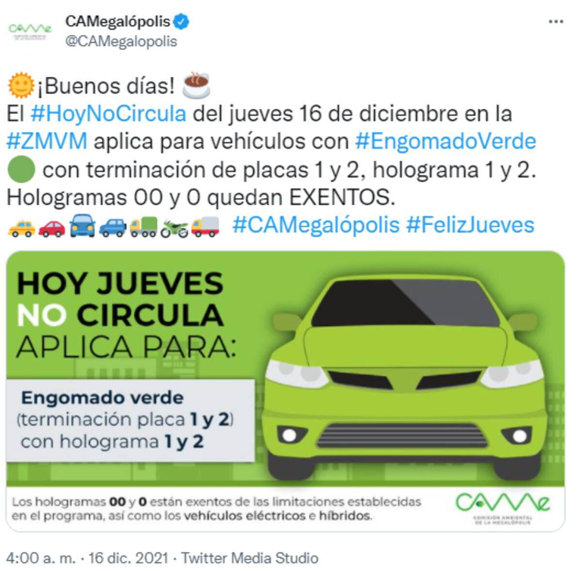 CIUDAD DE MÉXICO.- Este jueves 16 de diciembre el Hoy No Circula aplica para los siguientes vehículos: