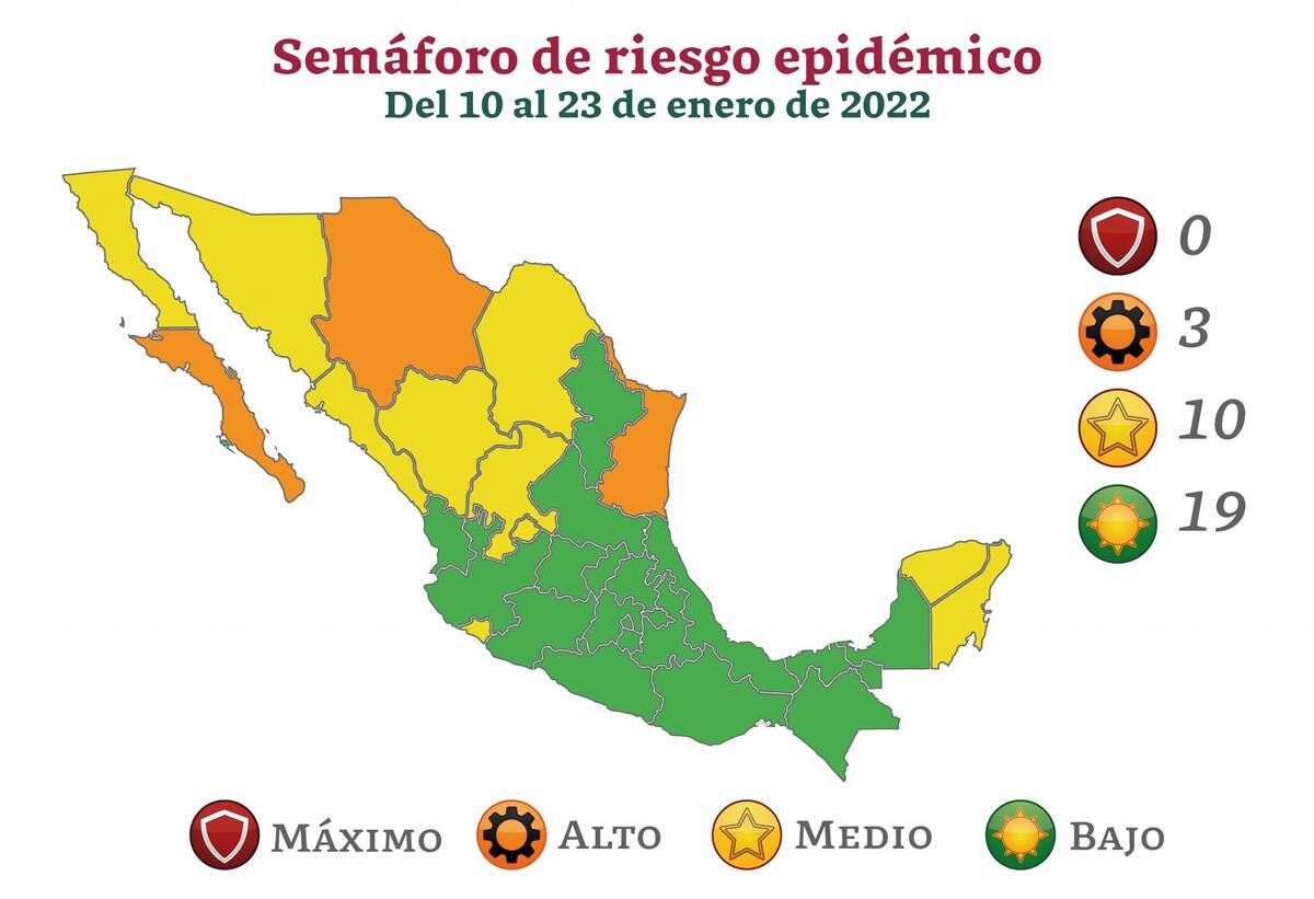 Por color en el semáforo epidemiológico se distribuyen 19 entidades en verde (riesgo bajo), 10 en amarillo (riesgo medio) y 3 en naranja (riesgo alto).