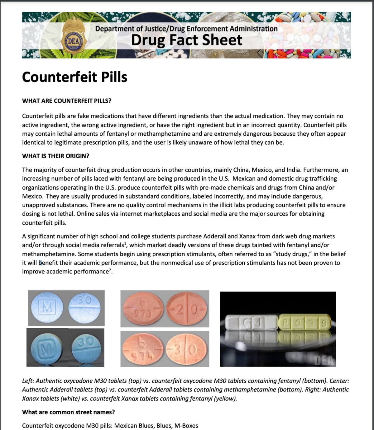 Podrían no contener el ingrediente activo (oxycodona), el ingrediente activo erróneo ó el ingrediente activo pero la cantidad incorrecta, las pastillas falsas pueden contener cantidades letales de fentanilo o metanfetamina y son extremadamente peligrosas”, dice el alertamiento de la DEA.