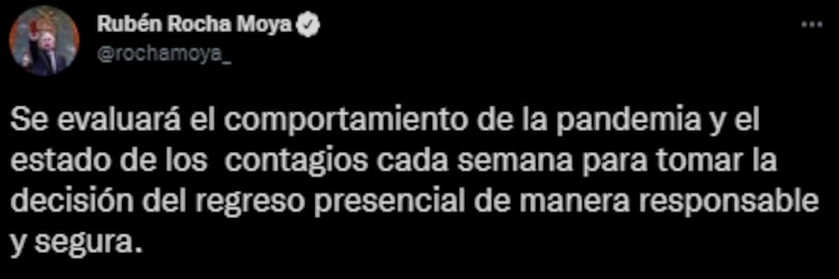 Con un mensaje en Twitter, el gobernador del Estado, Rubén Rocha Moya informó que se pospone el regreso presencial a clases que se tenía programado para el 17 de enero, en atención a los reportes de las autoridades de salud Nacional y Estatal.