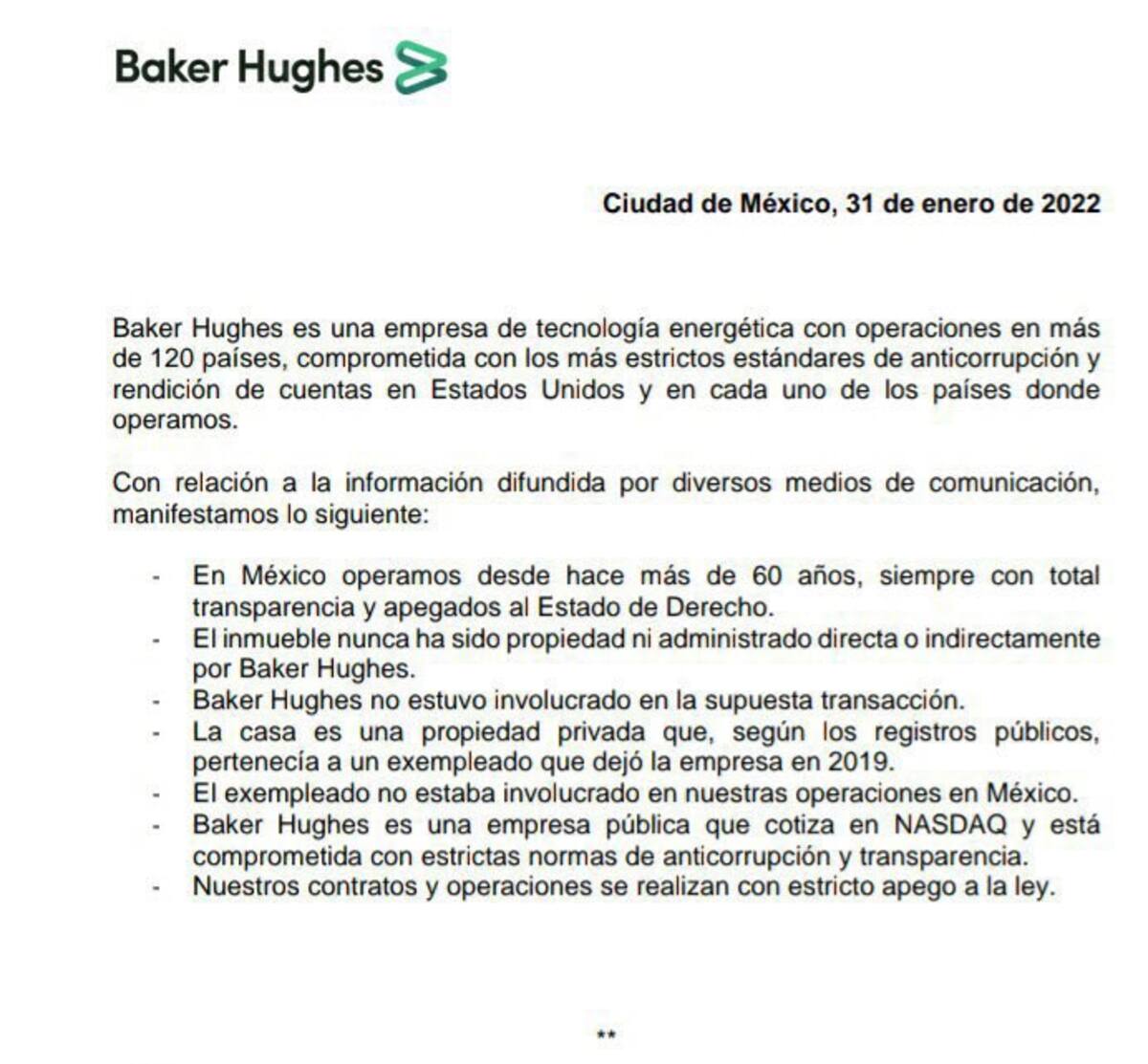 Baker Hughes asegura que es una empresa pública que cotiza en Nasdaq y está comprometida con estrictas medidas de anticorrupción y transparencia, además de que sus “contratos y operaciones se realizan con estricto apego a la ley”.