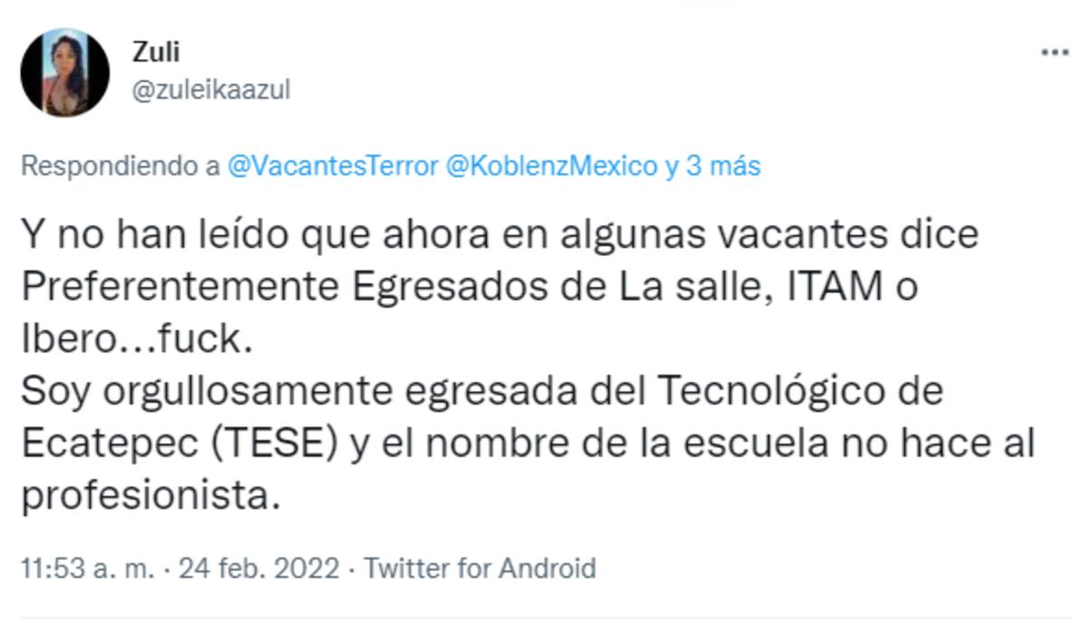 Otros usuarios señalaron que también se han encontrado con vacantes donde se pide que los postulantes sean egresados de instituciones educativas específicas.