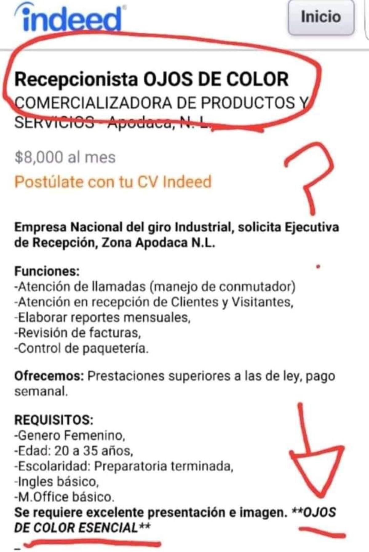 Otra de las vacantes que también causó enojo fue la que desde el inicio indicó que solicitaba a una “recepcionista OJOS DE COLOR” para una comercializadora de productos y servicios en Apodaca, Nuevo León.