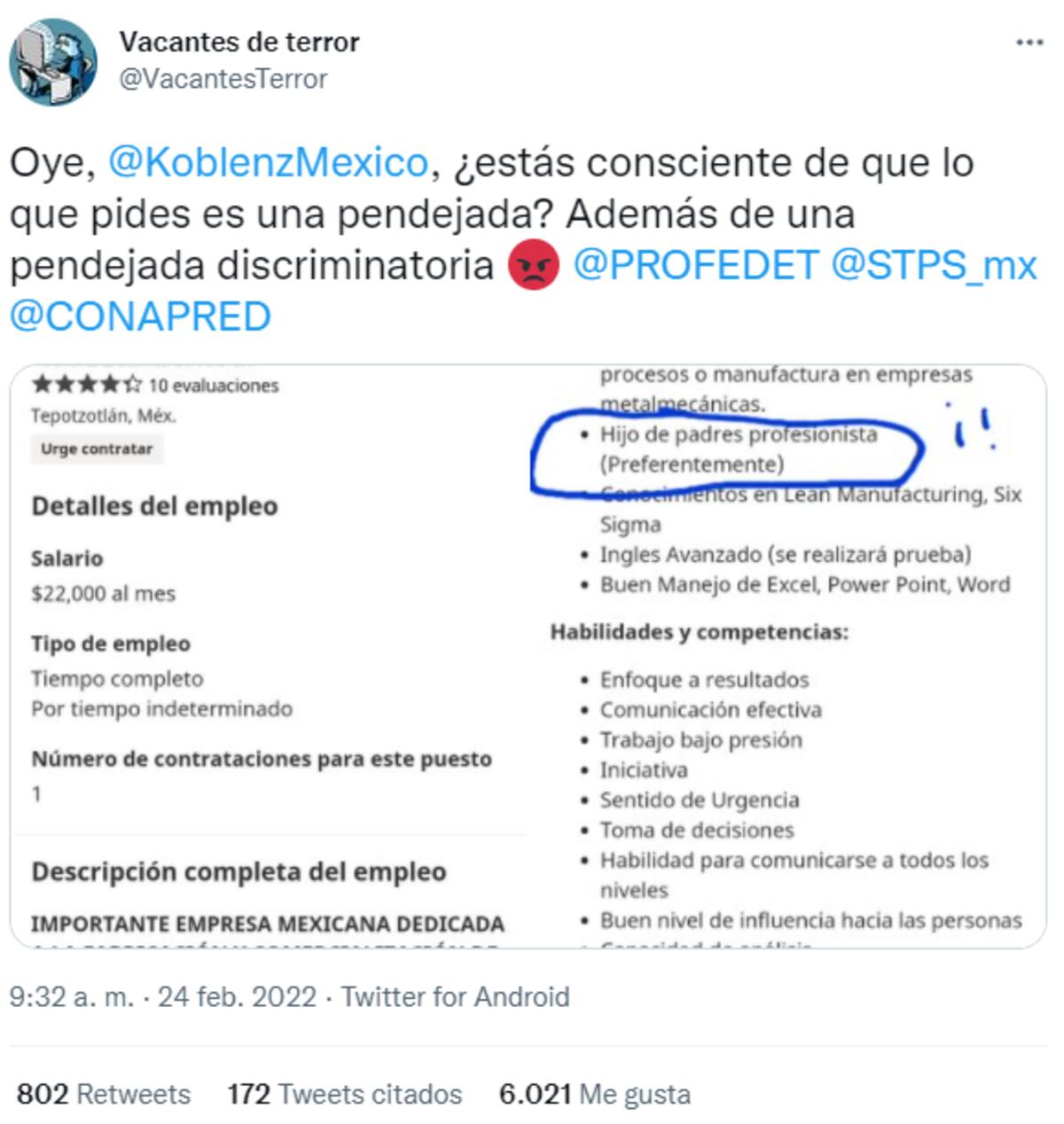Si bien parecía que todo estaba en orden al mencionar los detalles del sueldo, empleo y requerimientos para la postulación, lo que causó indignación entre los usuarios fue que en los requisitos solicitaban “preferentemente” a una persona “hijo de padres profesionistas” para el puesto.