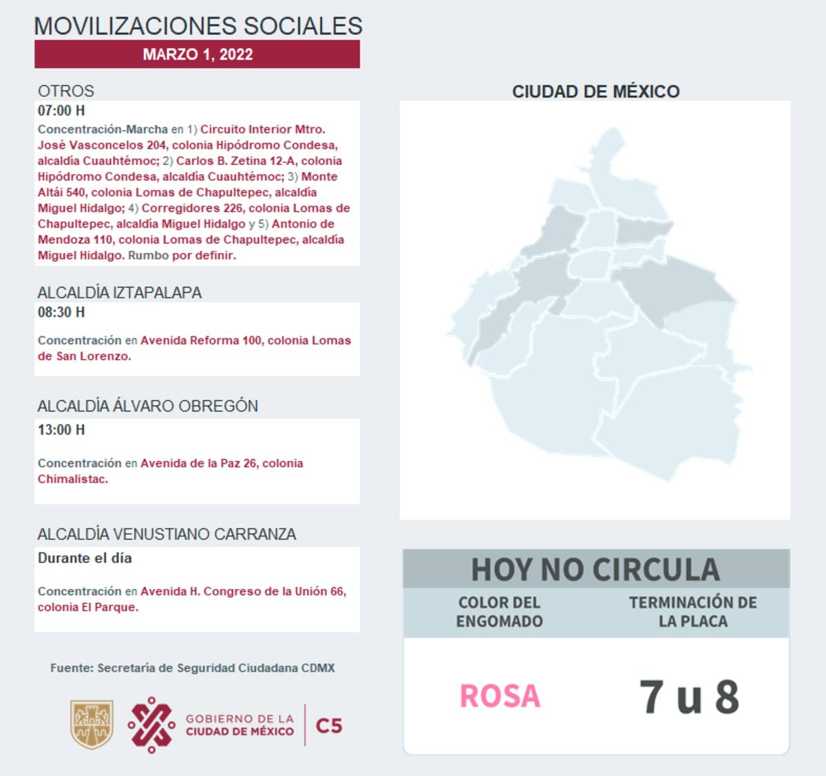 - 7:00 horas: Concentración-Marcha en 1) Circuito Interior Mtro. José Vasconcelos 204, colonia Hipódromo Condesa, alcaldía Cuauhtémoc; 2) Carlos B. Zetina 12-A, colonia Hipódromo Condesa, alcaldía Cuauhtémoc; 3) Monte Altái 540, colonia Lomas de Chapultepec, alcaldía Miguel Hidalgo; 4) Corregidora 226, colonia Lomas de Chapultepec, alcaldía Miguel Hidalgo y 5) Antonio de Mendoza 110, colonia Lomas de Chapultepec, alcaldía Miguel Hidalgo. Rumbo por definir.