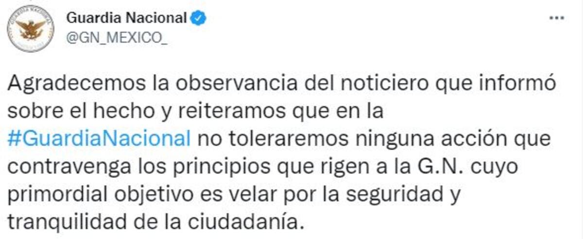 Tras dichos actos, la cuenta de Twitter de la Guardia Nacional informó que personal de Asuntos Internos se trasladó al lugar de los hechos para iniciar las investigaciones correspondientes, prometiendo que no habrá impunidad.