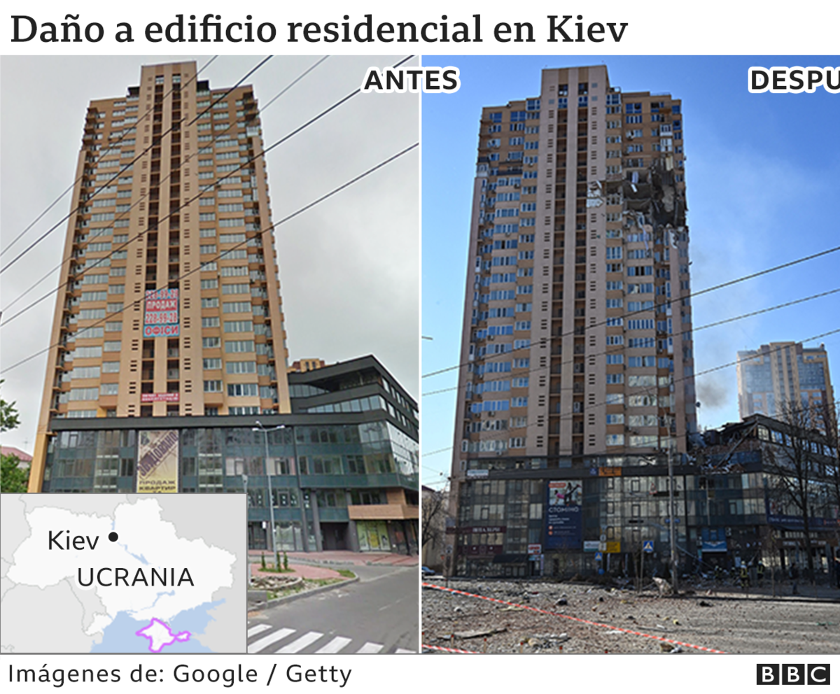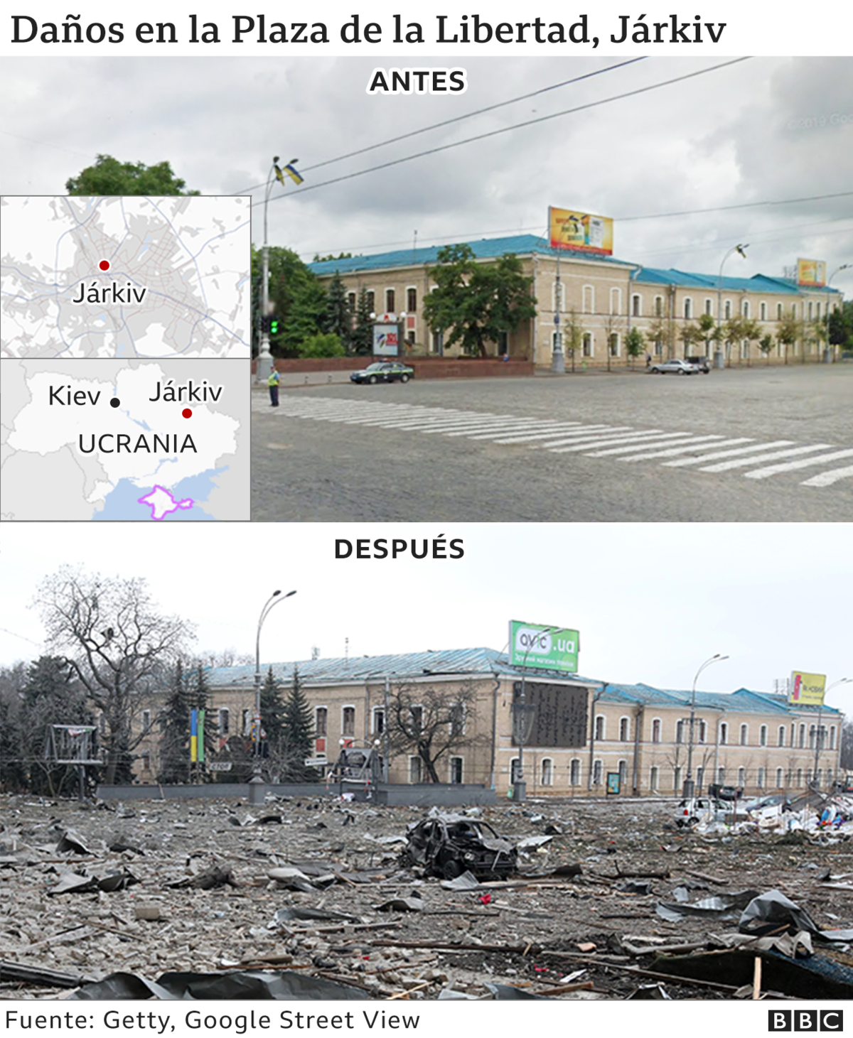 Estas imágenes del antes y el después muestran parte de la destrucción causada en áreas civiles por la invasión rusa, que comenzó el jueves de la semana pasada.