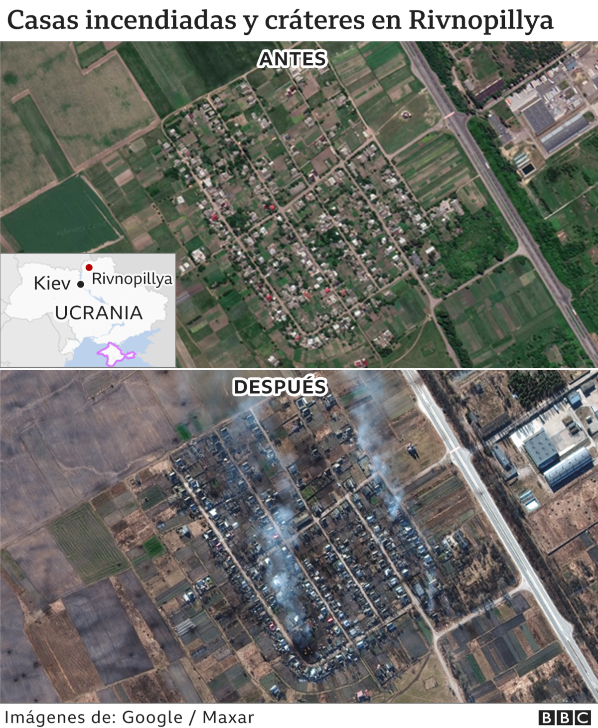 Las imágenes satelitales del pueblo cercano de Rivnopillya, que se encuentra justo al norte de Chernígov, muestran cráteres en el suelo y humo saliendo de las casas en llamas después de los ataques con misiles de las fuerzas rusas.