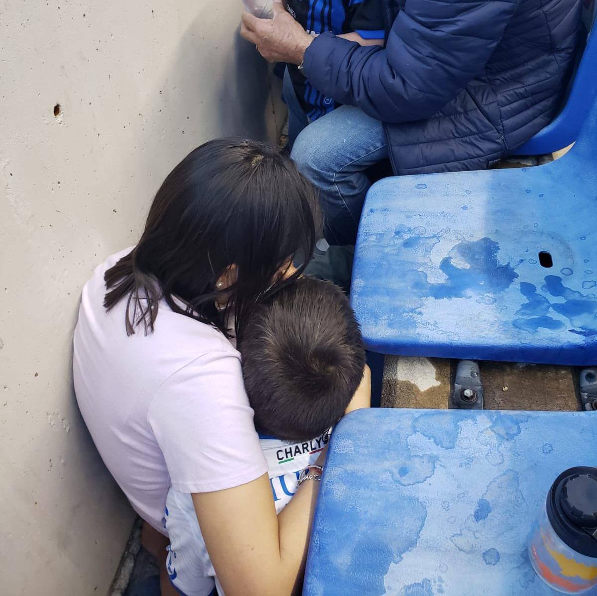 En una de las imágenes, un hombre corre en la cancha mientras agarra la mano de su esposa e hijos, en busca de huir del lugar, mientras que en otra, una mujer abraza a un niño, escondidos detrás de la barda de las gradas.