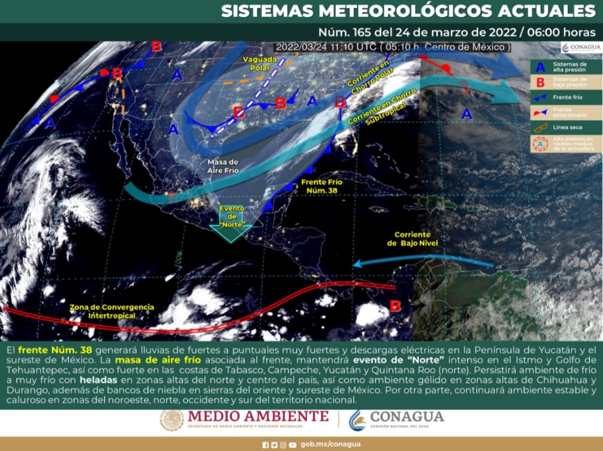 CIUDAD DE MÉXICO.- Durante este jueves 24 de marzo, el frente Núm. 38 recorrerá la Península de Yucatán y el Sureste de México, generando lluvias de fuertes a puntuales muy fuertes, las cuales se acompañarán de descargas eléctricas en dichas regiones. Al final del día, se pronostica que dicho frente se extienda sobre el Mar Caribe.