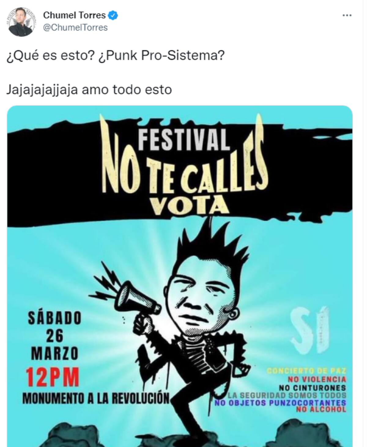 A través de su cuenta de Twitter, el conductor de “El Pulso de la República”, Chumel Torres, emitió su postura sobre el evento, junto al póster de las bandas que formarán parte de él.