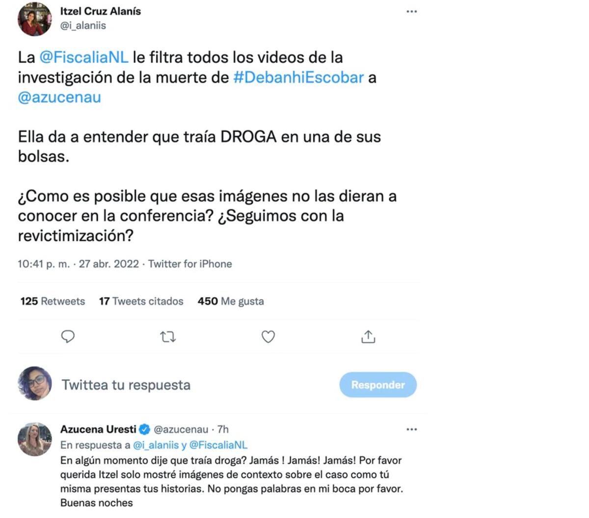 "La Fiscalía filtró videos a Azucena, ella da a entender que Debanhi traía droga ¿Cómo es posible que esas imágenes no las dieron en la conferencia? ¿Seguimos con la revictimización?", comentó Itzel en Twitter.