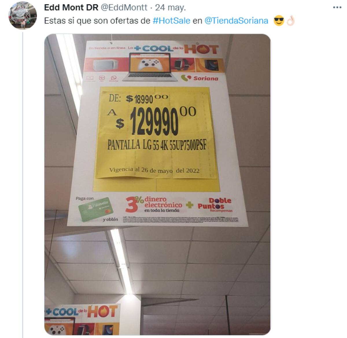 No obstante, en el Hot Sale de este 2022, el usuario @EddMontt publicó una fotografía donde el supermercado Soriana muestra una “oferta” de una pantalla LG 4K de 55 pulgadas a 129 mil 999 pesos, cuyo precio original era de 18 mil 990 pesos.