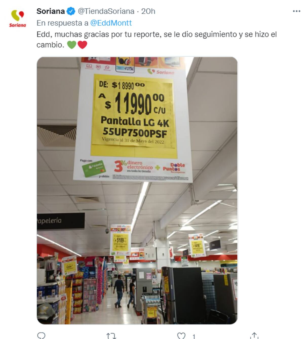 Posteriormente, la tienda Soriana se puso en contacto con el denunciante y le comentó que, tras el reporte, el precio ya había sido modificado.