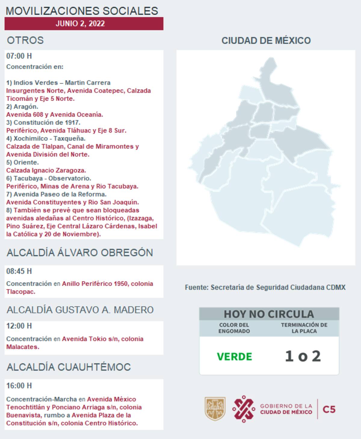 CIUDAD DE MÉXICO.- Antes de salir de casa este jueves 2 de junio, revisa las movilizaciones sociales, marchas y protestas programadas para hoy en la Ciudad de México.