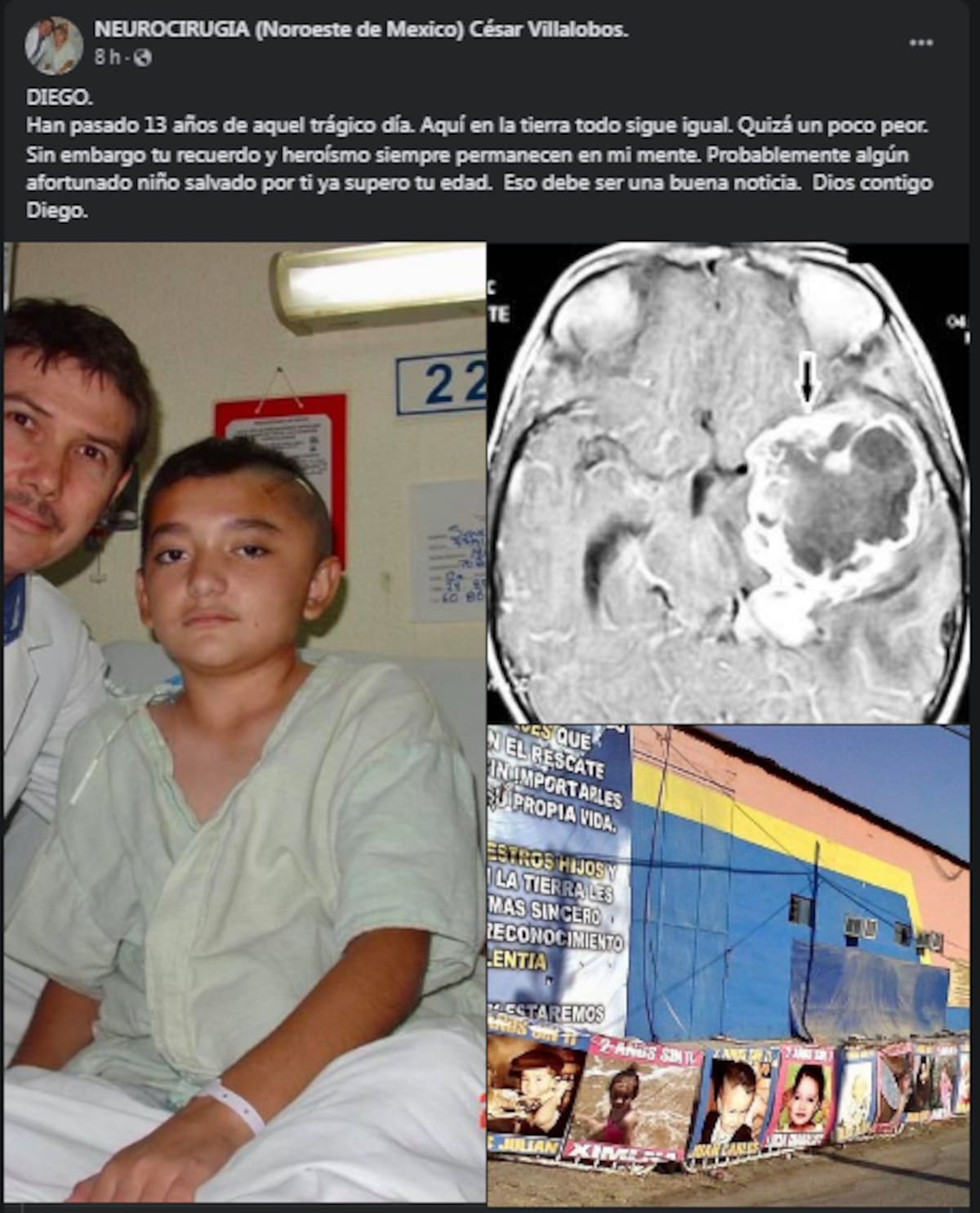 HERMOSILLO, Sonora.- Diego, un niño de 12 años, es recordado cada 5 de junio, a 14 años del trágico incendio en la Guardería ABC, por el neurocirujano César Villalobos, quien lo llama "el 50" y lo considera como su paciente más especial por el heroísmo que permanece en la mente del especialista.