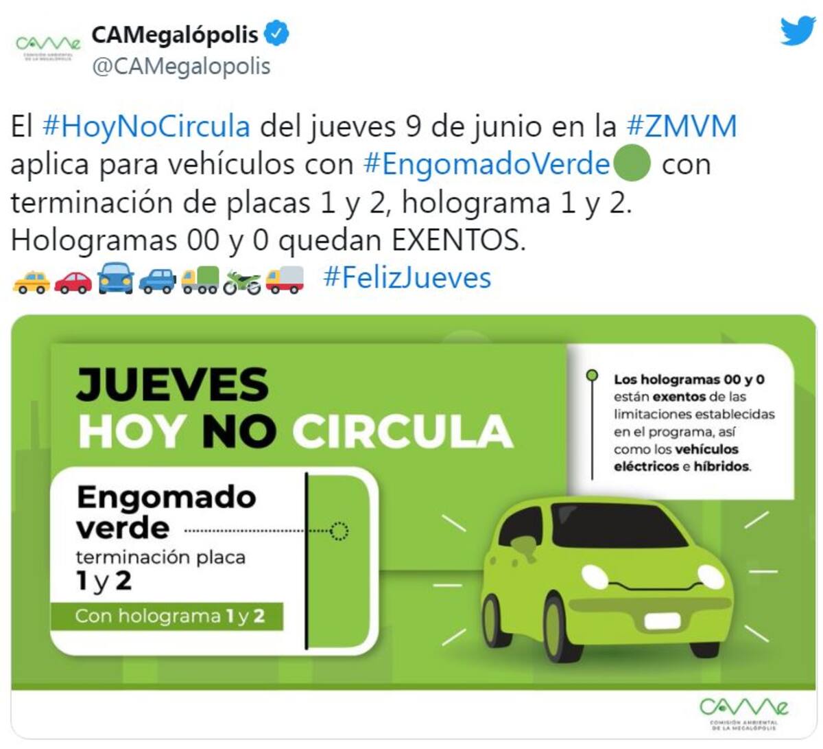 CIUDAD DE MÉXICO.- De acuerdo con la Comisión Ambiental de la Megalópolis (CAMe) este jueves 9 de junio los vehículos que no pueden transitar libremente debido al Hoy No Circula son: