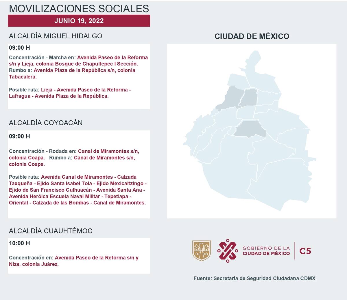 CIUDAD DE MÉXICO.- Antes de salir de casa este domingo 19 de junio, revisa las movilizaciones sociales, marchas y protestas programadas para hoy en la Ciudad de México.