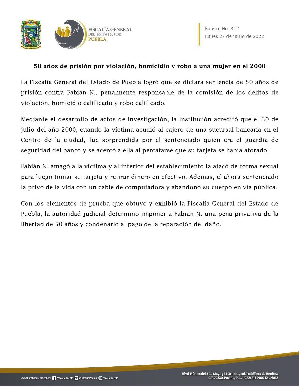 La Fiscalía General de Justicia del Estado de Puebla dio a conocer a través de un comunicado de prensa sobre la condena de Fabián “N”, tras ser encontrado culpable de los delitos anteriormente mencionados.