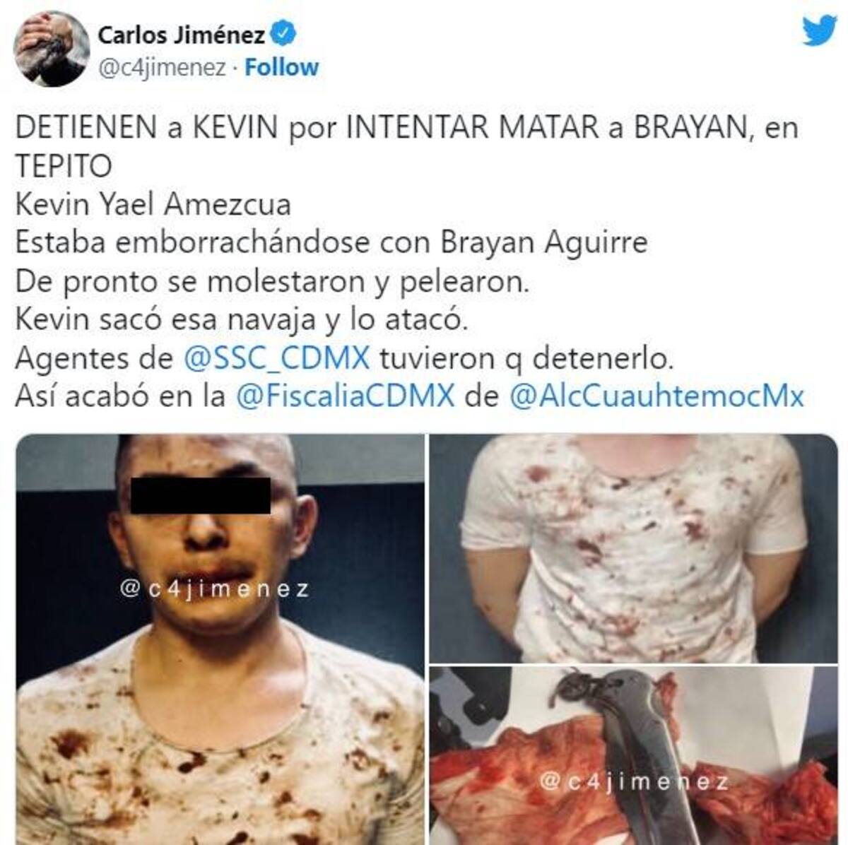 Detienen a Kevin por intentar matar a Brayan, en Tepito. Kevin Yael Amezcua estaba emborrachándose con Brayan Aguirre y de pronto se molestaron y pelearon. Kevin sacó esa navaja y lo atacó. Agentes de SSC CDMX tuvieron q detenerlo. Así acabó en la Fiscalía CDMX”, escribió el reportero.