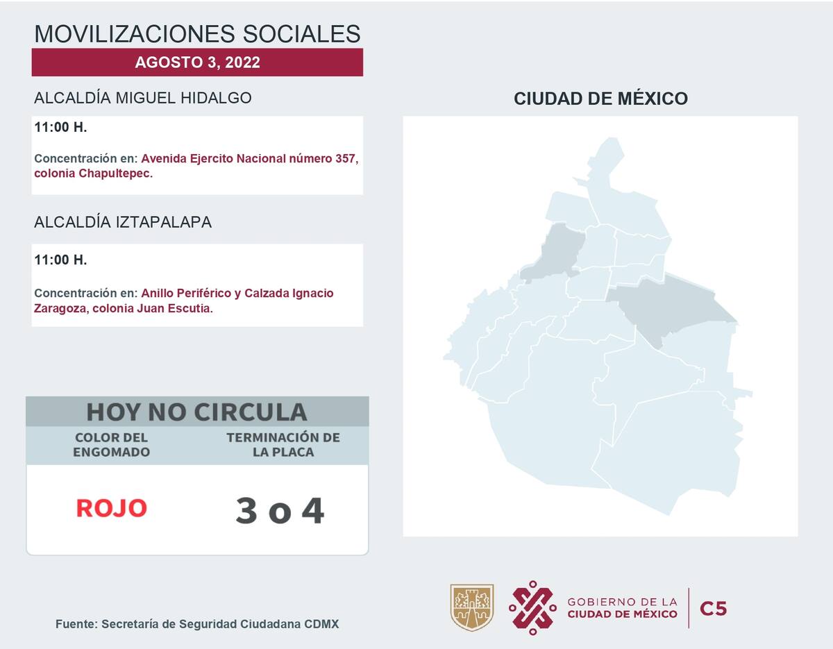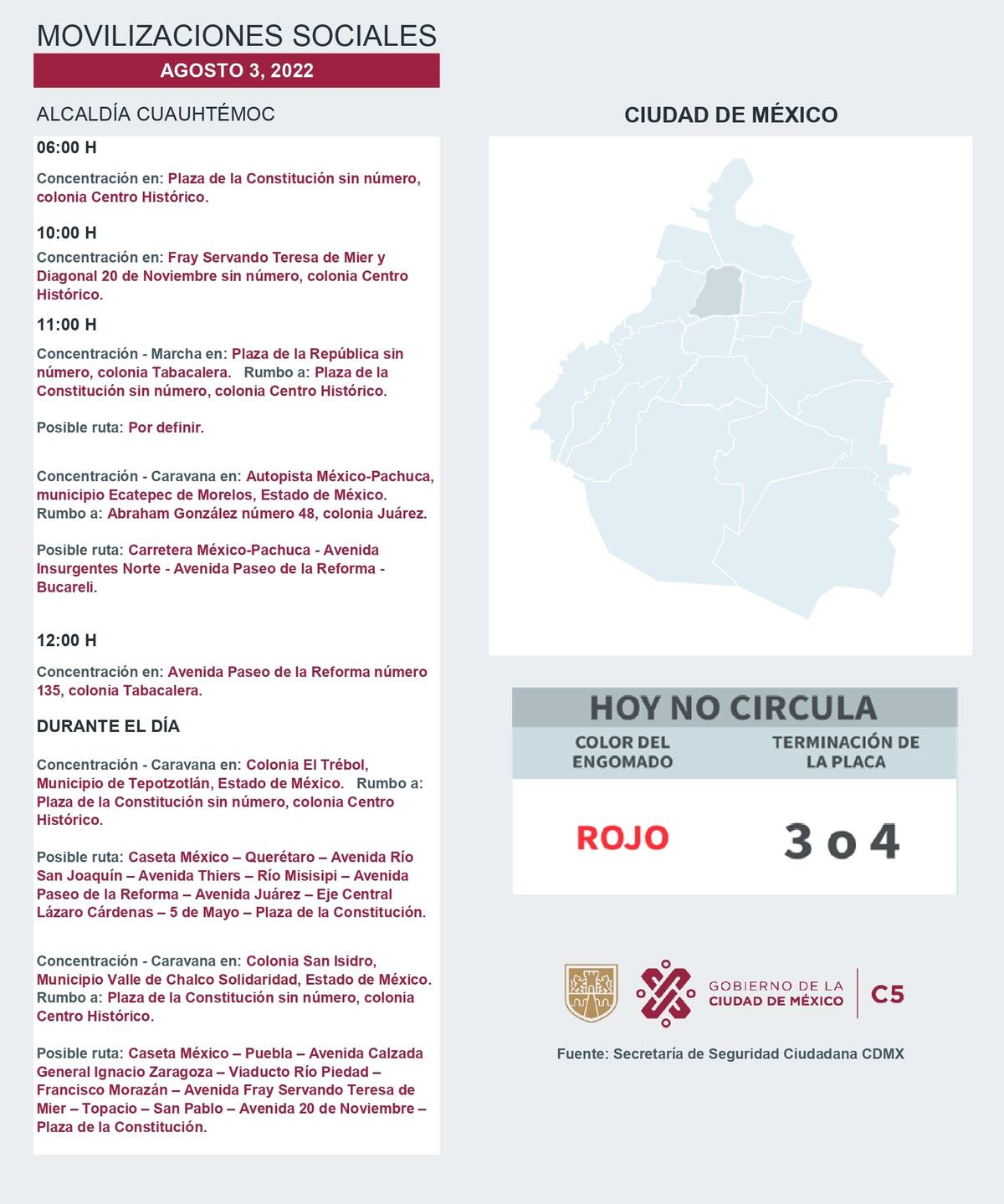 CIUDAD DE MÉXICO.- Antes de salir de casa este miércoles 3 de agosto, revisa las movilizaciones sociales, marchas y protestas programadas para hoy en la Ciudad de México.