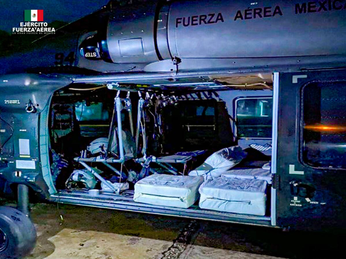 Al sitio del aterrizaje arribaron los helicópteros UH-60 transportando a la Fuerza de Reacción helitransportada con elementos del Ejército y Fuerza Aérea Mexicanos, quienes inspeccionaron la aeronave sospechosa, localizando a inmediaciones 38 paquetes con un peso aproximado de 460.5 kilogramos de una sustancia con características similares a la cocaína (a reserva de que se haga la confirmación pericial de tipo y cantidad de la misma).
