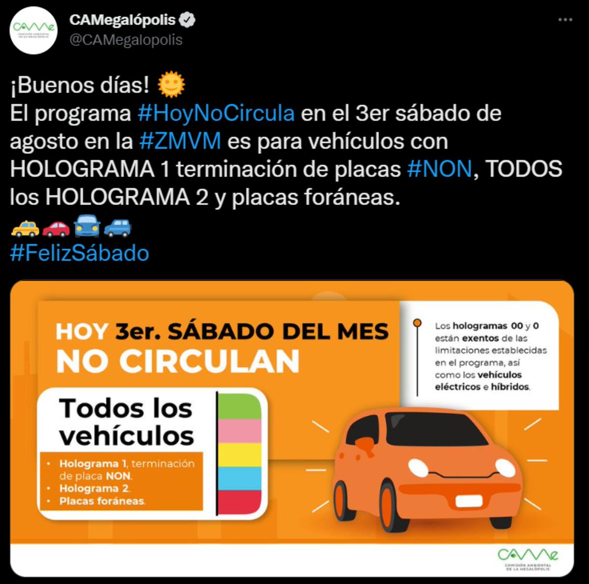 CIUDAD DE MÉXICO.- De acuerdo con la Comisión Ambiental de la Megalópolis (CAMe) para este sábado 20 de agosto, tercero del mes, los vehículos que no pueden salir de casa por el Hoy No Circula son: