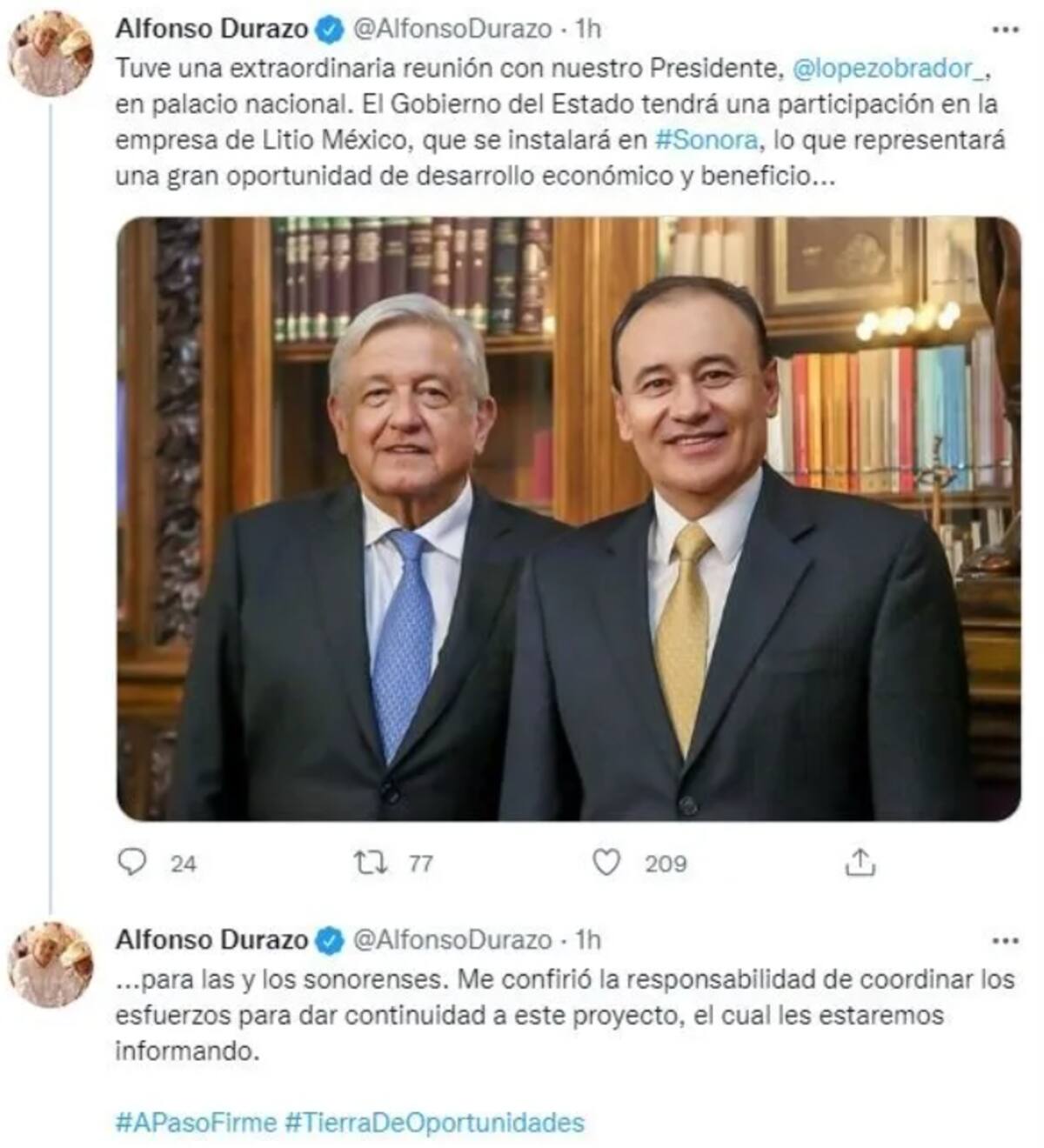 “Tuve una extraordinaria reunión con nuestro Presidente, @lopezobrador_, en palacio nacional. El Gobierno del Estado tendrá una participación en la empresa de Litio México, que se instalará en #Sonora, lo que representará una gran oportunidad de desarrollo económico y beneficio…”, escribió.