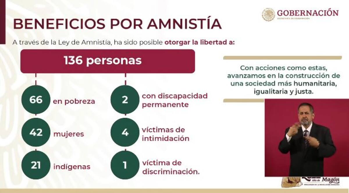 A través de la Ley de Amnistía, han otorgado la libertad a 136 personas: 66 en pobreza; 42 mujeres; 21 indígenas; 2 con discapacidad permanente; 4 víctimas de intimidación y una víctima de discriminación.