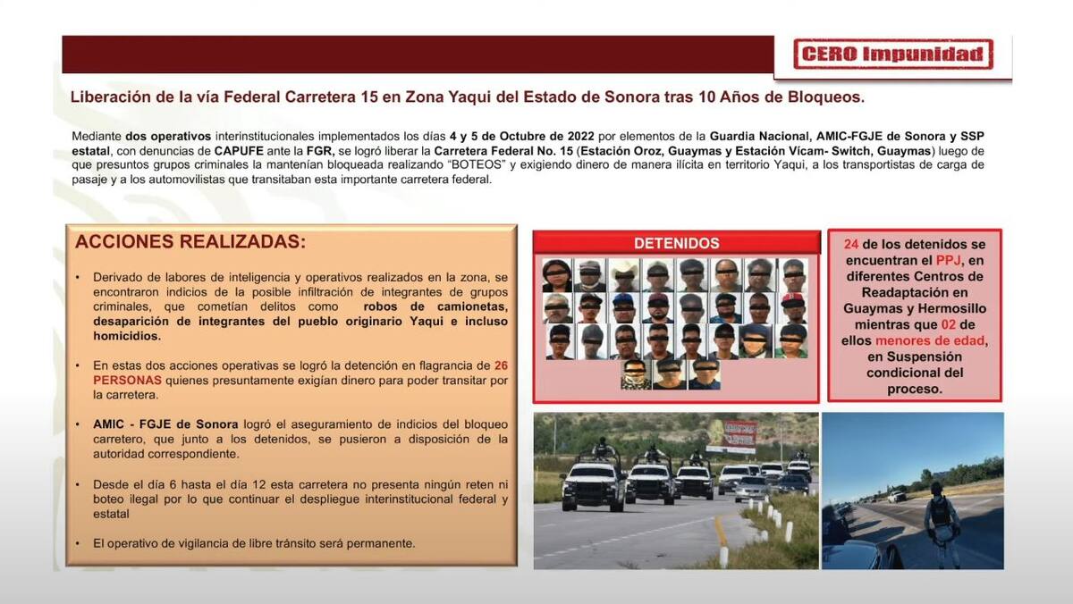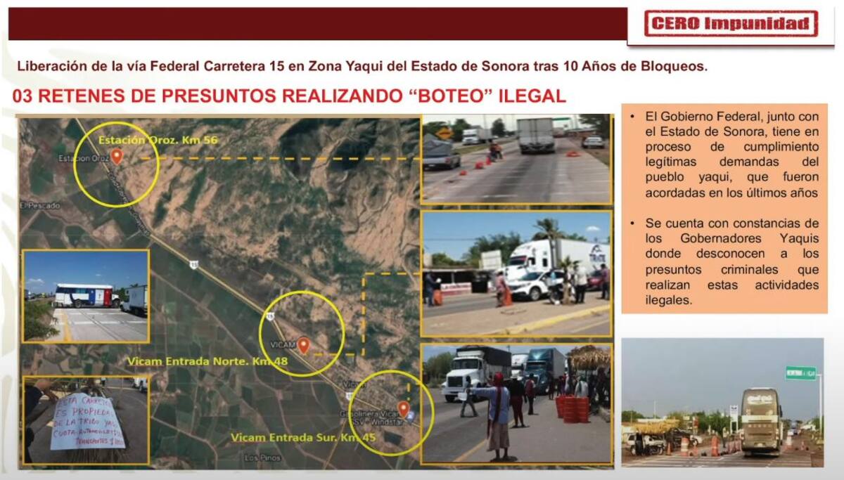 Había tres bloqueos que querían reivindicar supuestas demandas, pero fueron desconocidos en varias ocasiones por autoridades Yaquis, pues generaban extorsión y bloqueos ilegales, además de servir como estructura de cobertura para organizaciones delictivas”, dijo.