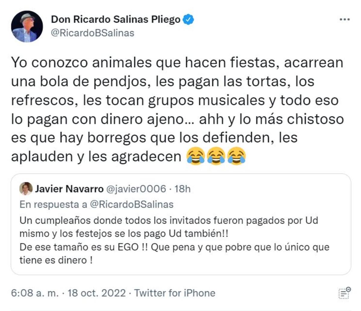 “Un cumpleaños donde todos los invitados fueron pagados por usted mismo y los festejos se los pagó usted también ¡De ese tamaño es su EGO! ¡Qué pena y que pobre que lo único que tiene es dinero!”, le dijo Javier Navarro.