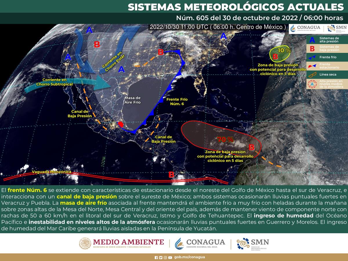 El frente frío Núm. 6 se extenderá con características de estacionario desde el Noreste del Golfo de México hasta el Sur de Veracruz.
