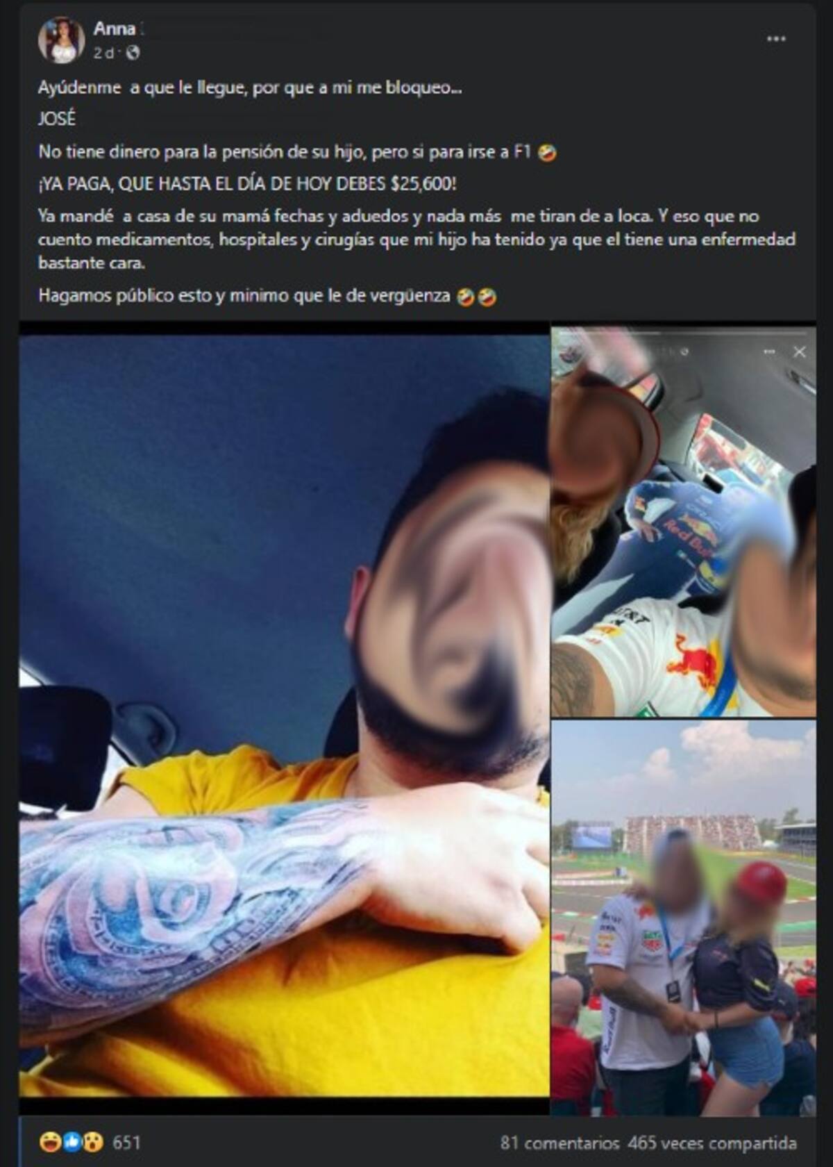 Ayúdenme a que le llegue, porque a mí me bloqueó... No tiene dinero para la pensión de su hijo, pero si para irse a F1 ¡YA PAGA, QUE HASTA EL DÍA DE HOY DEBES $25,600!", se puede leer en la publicación.