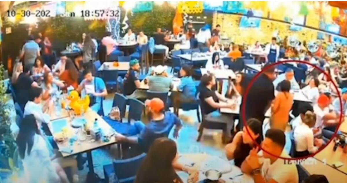 Se puede ver al grupo de amigos, a través de la cámara exterior, retirarse del restaurante en una camioneta negra.