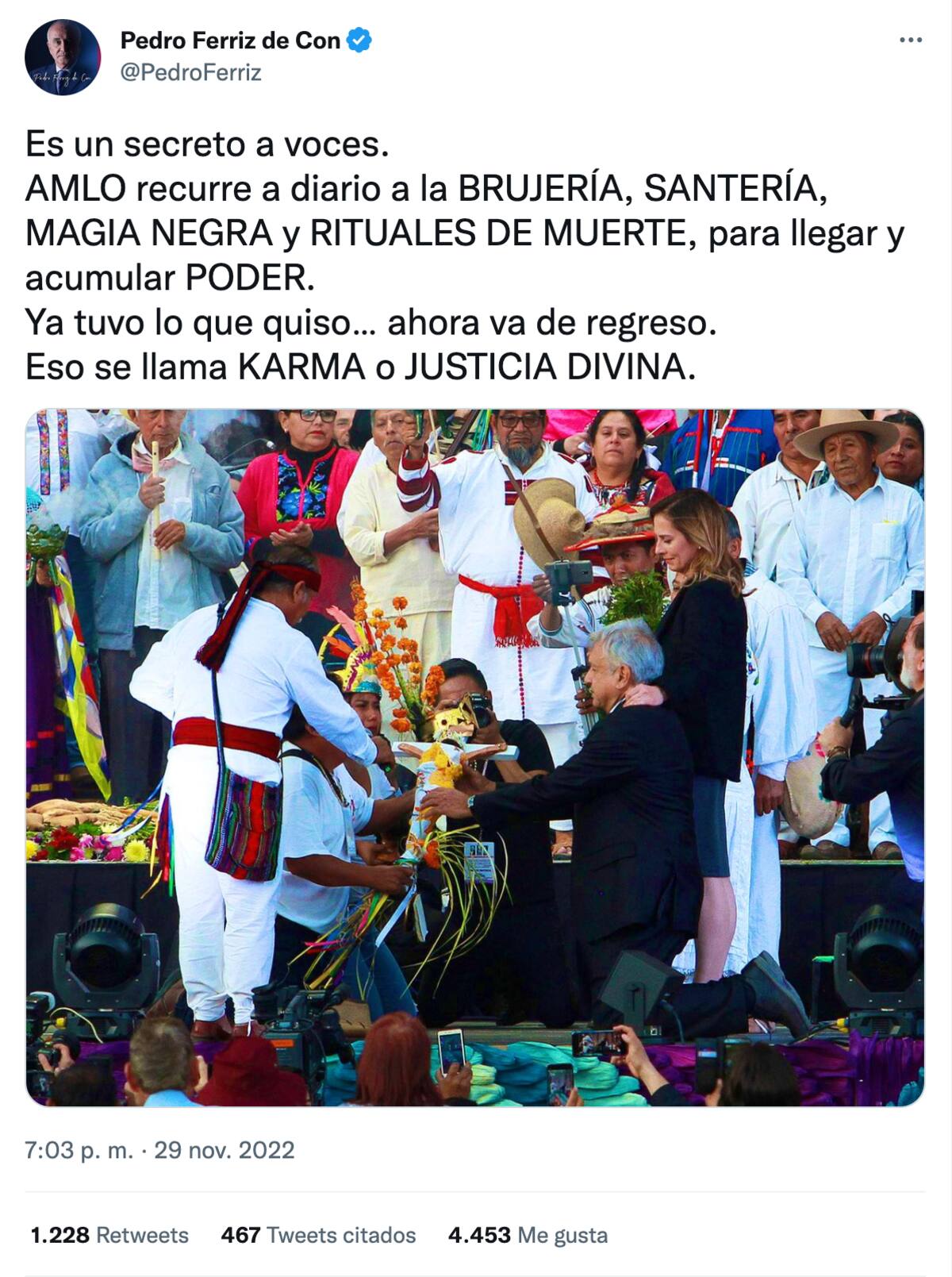 Pedro Ferriz de Con publicó un comentario en Twitter acusando al presidente Andrés Manuel López Obrador de magia negra e incluso de ser aprendiz de brujo, además de postear foto de AMLO durante una ceremonia tradicional con pueblos indígenas.