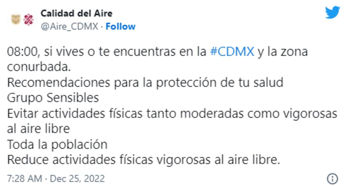 Por su parte, el Sistema de Monitoreo Atmosférico hizo una serie de recomendaciones a los capitalinos ante esta situación para que los grupos sensibles y la población en general eviten realizar actividades físicas tanto moderadas como vigorosas al aire libre, pidiendo pasar la Navidad en casa.
