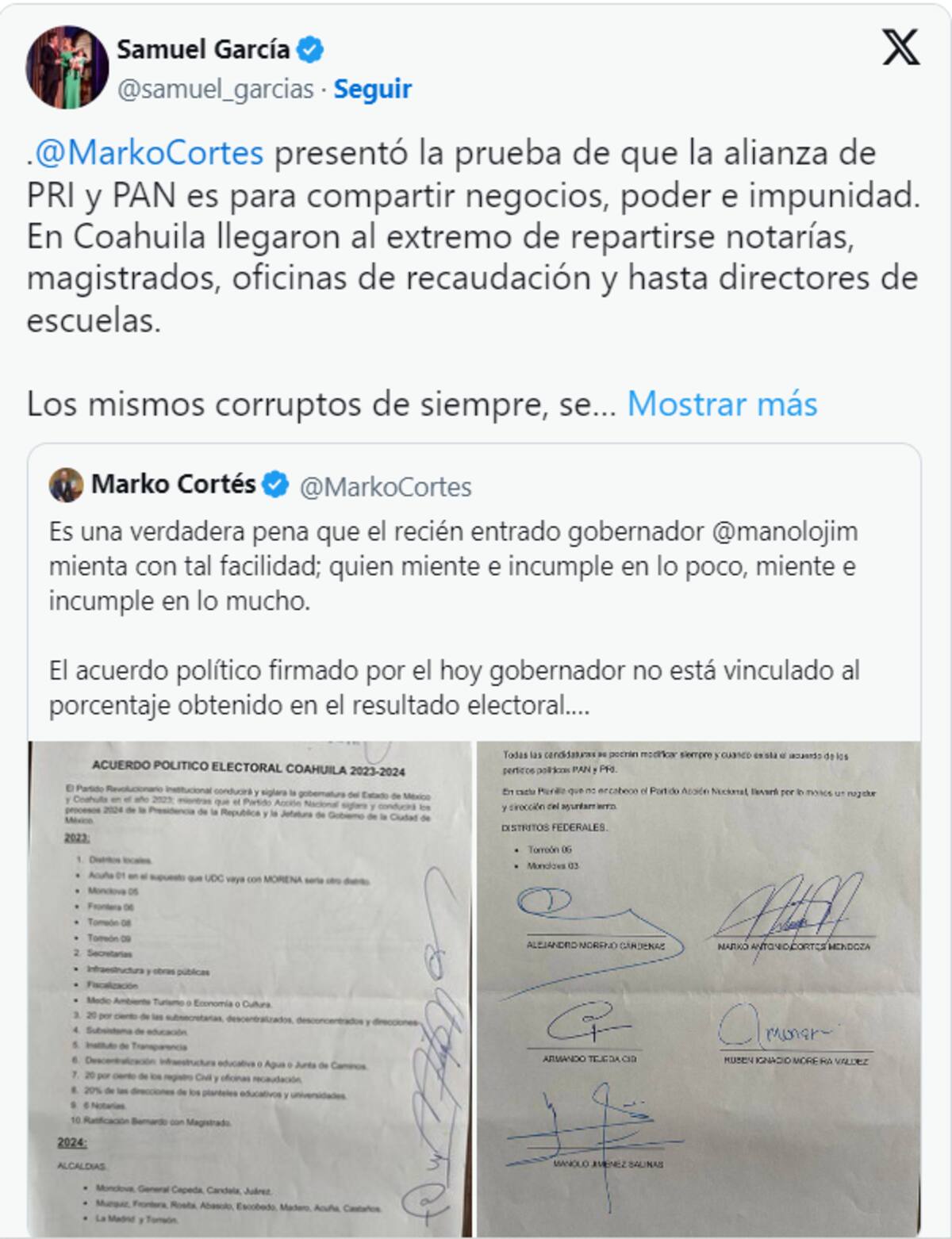 Marko Cortés difundió un documento donde se repartieron notarías, magistrados, oficinas de recaudación y hasta directores de escuelas en Coahuila.