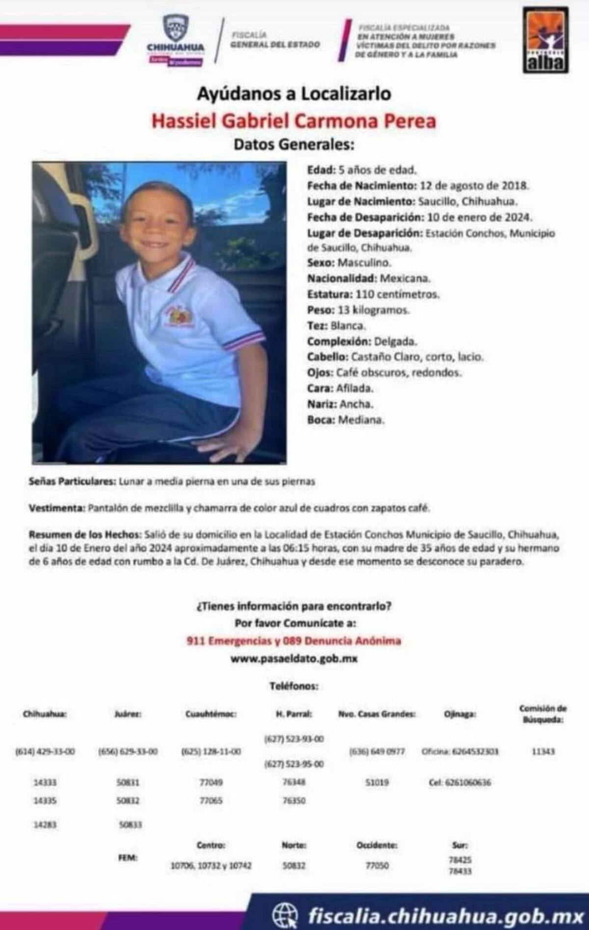 Hassiel Gabriel Carmona Perea, de 5 años, mide 1.10 metros, pesa 13 kilogramos, tiene complexión delgada, tez blanca, cabello castaño claro corto y lacio, ojos café oscuro redondos, y un lunar grande en una de sus piernas.