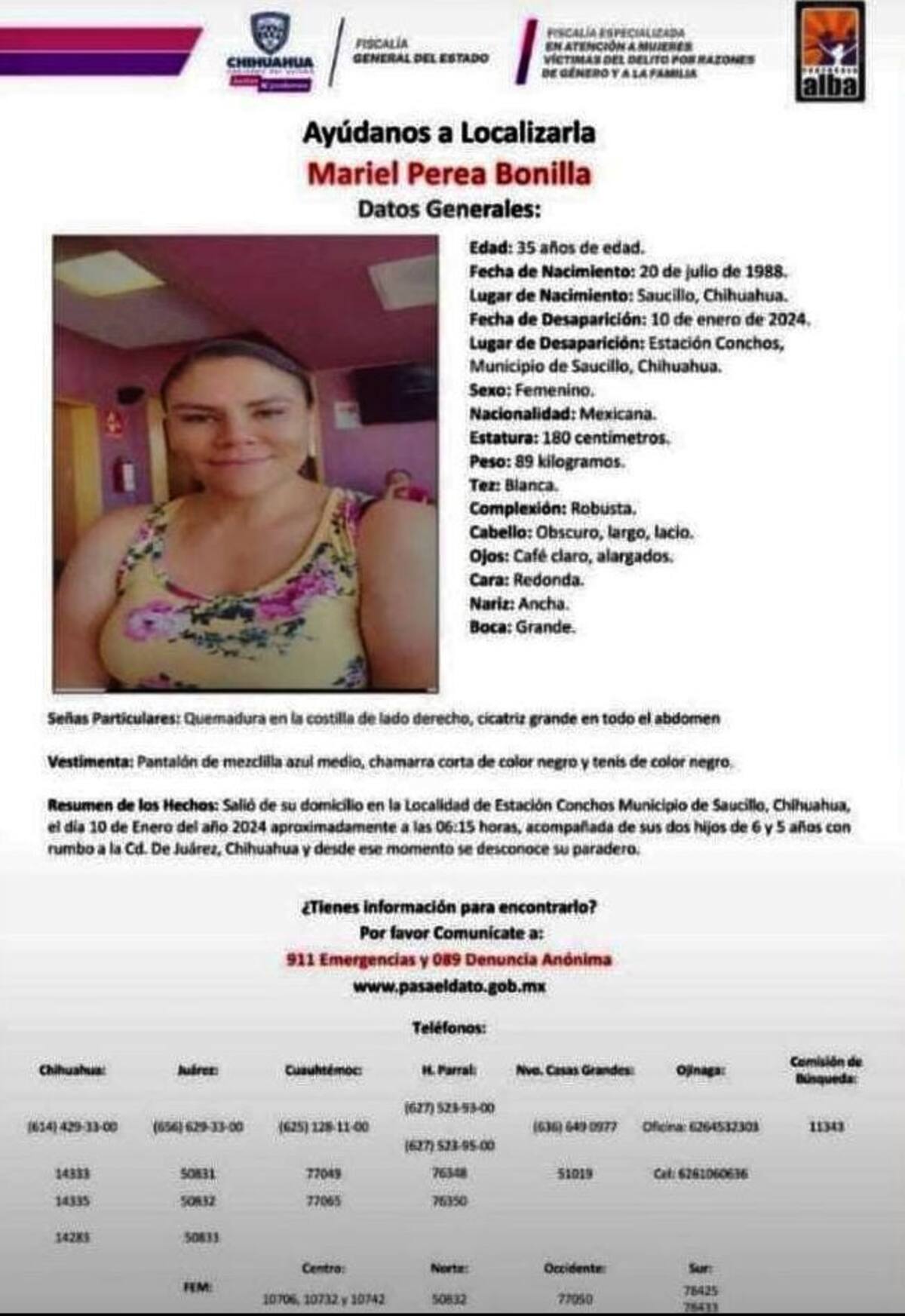 CHIHUAHUA.- Mariel, una joven madre de 35 años, y sus dos hijos, Norberto y Hassiel, de 6 y 5 años respectivamente, desaparecieron el pasado 10 de enero después de tomar un Uber afuera de su hogar en la Estación Conchos, Saucillo.