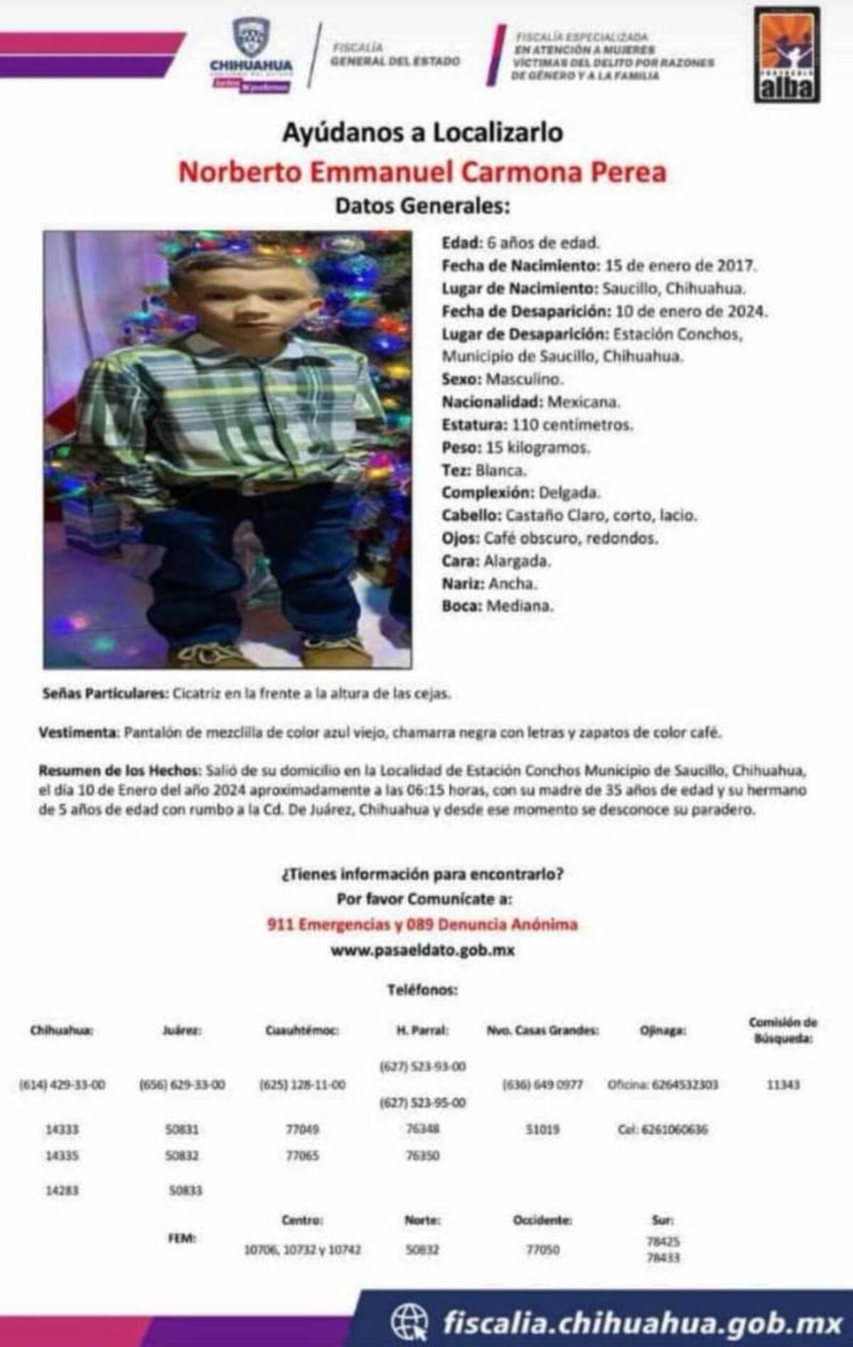 Norberto Emmanuel Carmona Perea, de 6 años, mide 1.10 metros, pesa 15 kilogramos, tiene complexión delgada, tez blanca, cabello castaño corto y lacio, ojos café oscuro redondos. Presenta una cicatriz cerca de sus cejas.