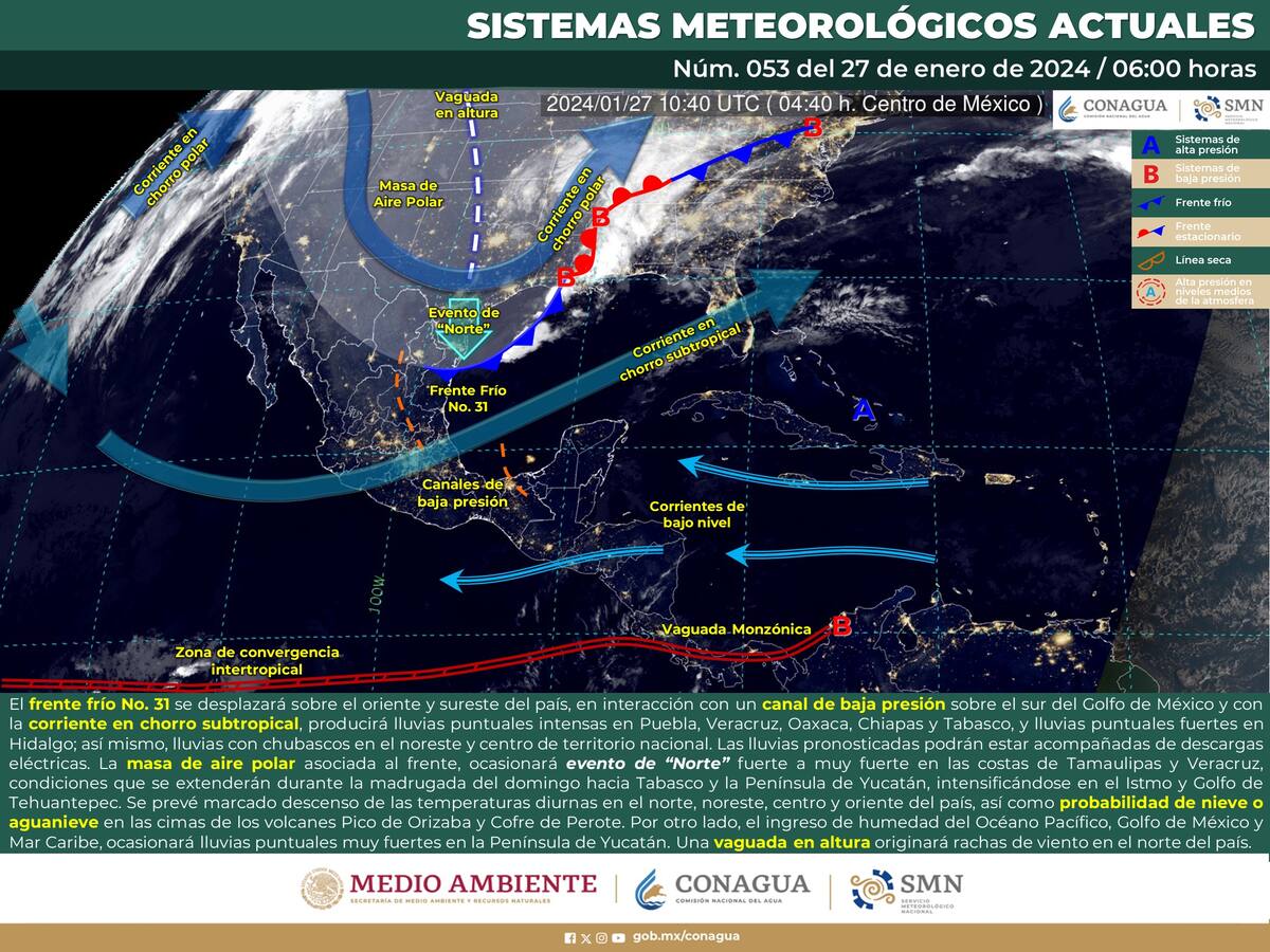 CIUDAD DE MÉXICO.- Durante este sábado, el frente frío No. 31 se desplazará sobre el Oriente y Sureste del país, en interacción con un canal de baja presión sobre el sur del Golfo de México y con la corriente en chorro subtropical, producirá lluvias puntuales intensas en Puebla, Veracruz, Oaxaca, Chiapas y Tabasco, y lluvias puntuales fuertes en Hidalgo; así mismo, lluvias con chubascos en el noreste y centro de territorio nacional.