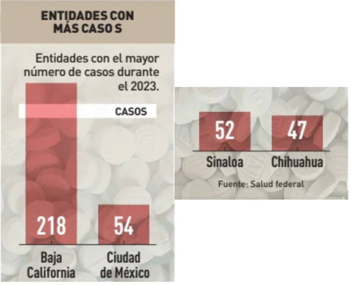 En 2023, las entidades con mayor número de casos fueron Baja California (218 casos), Ciudad de México (54 casos), Sinaloa (52 casos) y Chihuahua (47 casos), aspecto consistente con los estados donde se reporta mayor consumo de fentanilo.