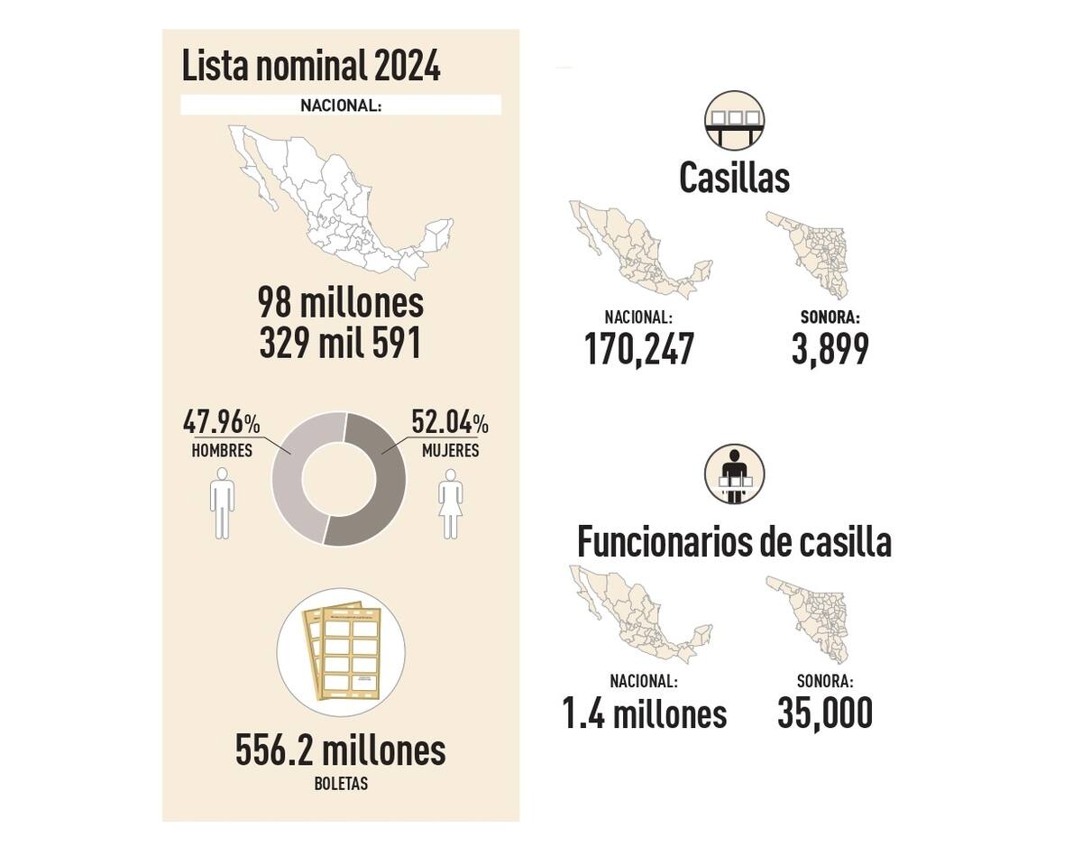 En el caso de Sonora se elegirán a 21 diputaciones locales y suplentes, 72 presidencias municipales y planillas y 40 regidurías étnicas para hacer un total de 3 mil 332 cargos.