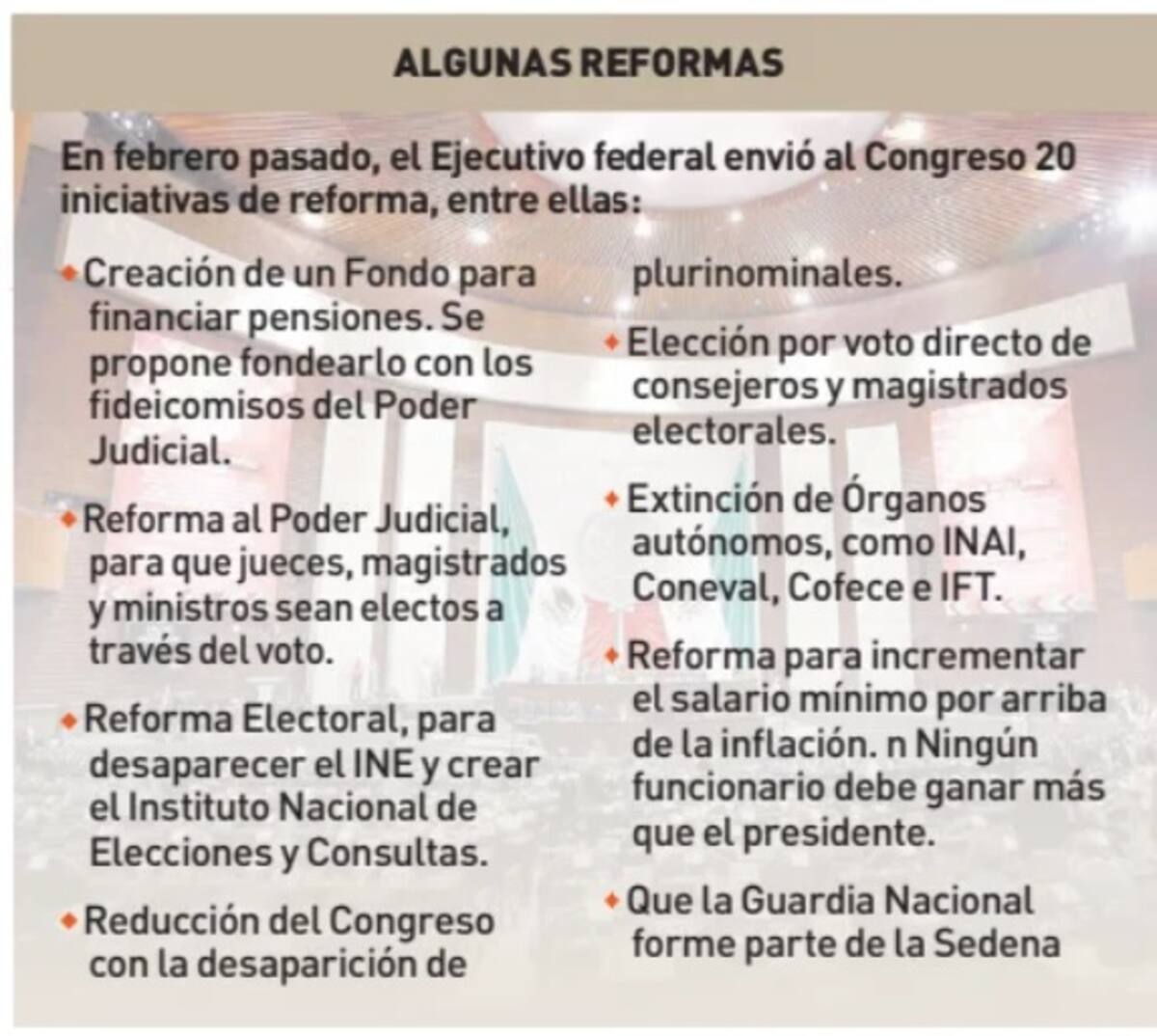 En rueda de prensa, indicó que el Ejecutivo federal presentó 18 reformas a la Constitución, más de 54 iniciativas que comprenden reformas a 54 diferentes apartados de la Constitución, entre ellas está la reforma al Poder Judicial