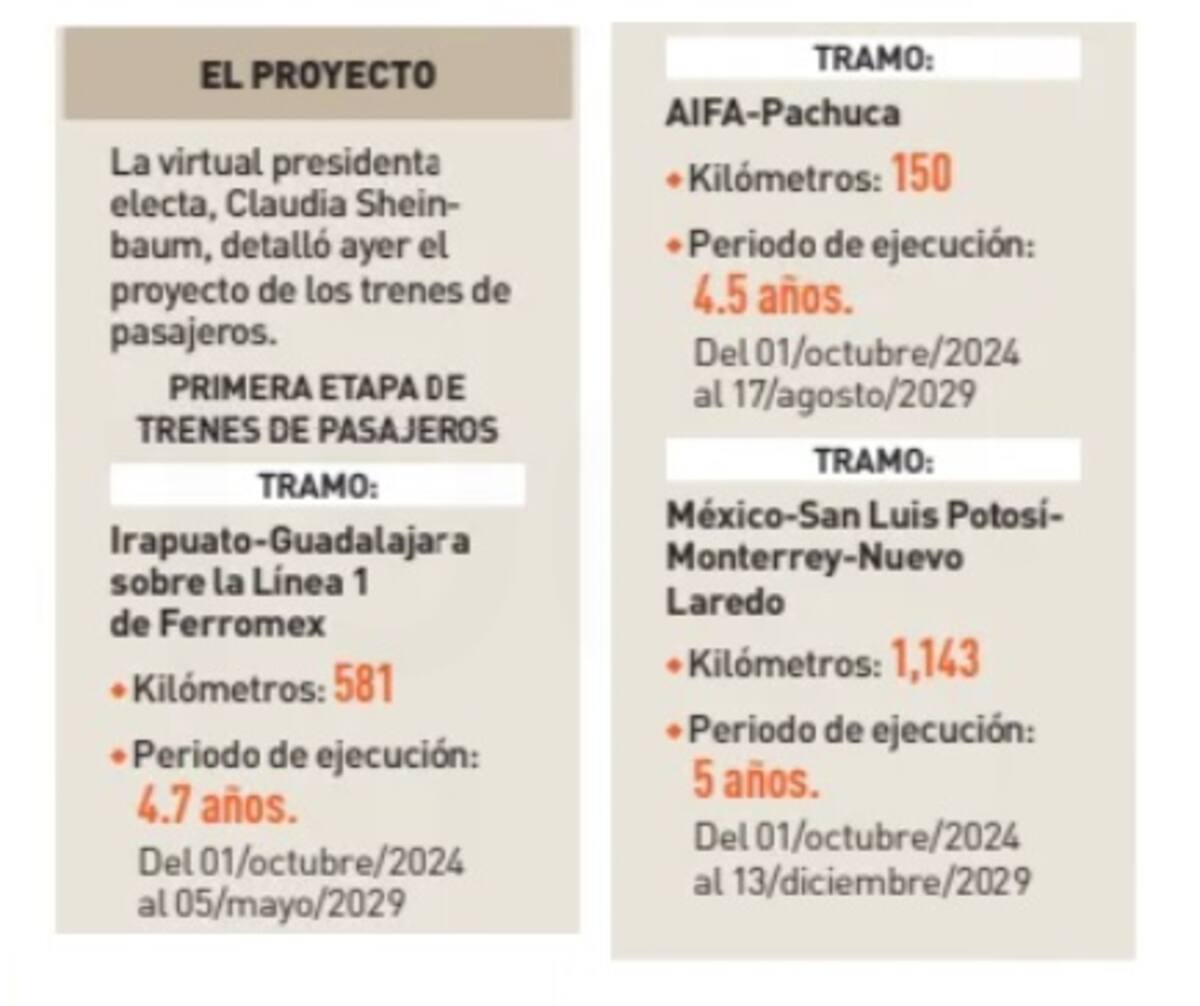 CIUDAD DE MÉXICO.- Aunque se estudia la posibilidad, la virtual presidenta electa Claudia Sheinbaum Pardo detalló el proyecto de los trenes de pasajeros, y Sonora y Baja California no están incluidos en un inicio, pues la ruta del pacífico sólo llegará hasta Guadalajara.