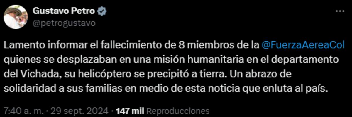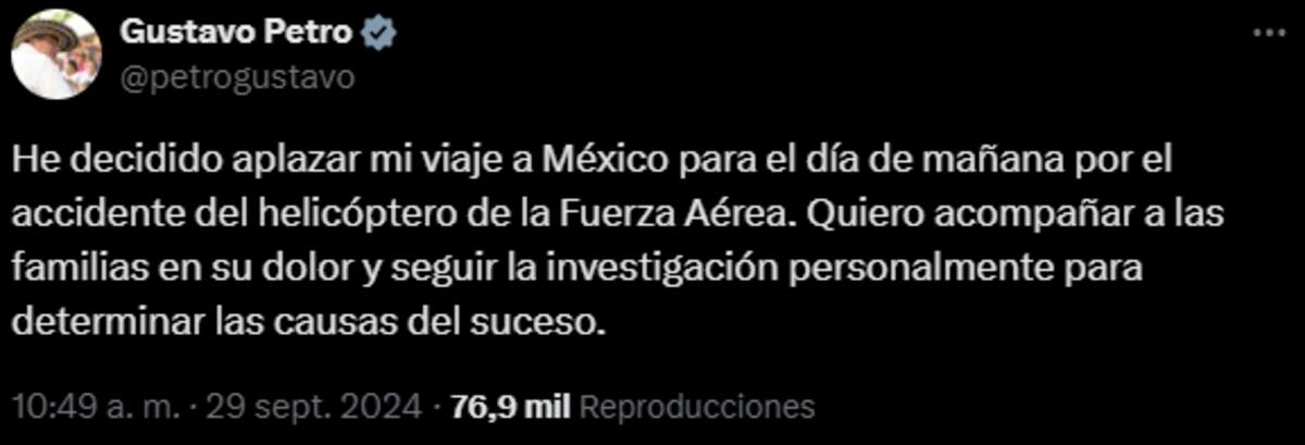 Ante el doloroso incidente, el presidente Petro comunicó en su red social: “He decidido aplazar mi viaje a México para el día de mañana por el accidente del helicóptero de la Fuerza Aérea. Quiero acompañar a las familias en su dolor y seguir la investigación personalmente para determinar las causas del suceso”.