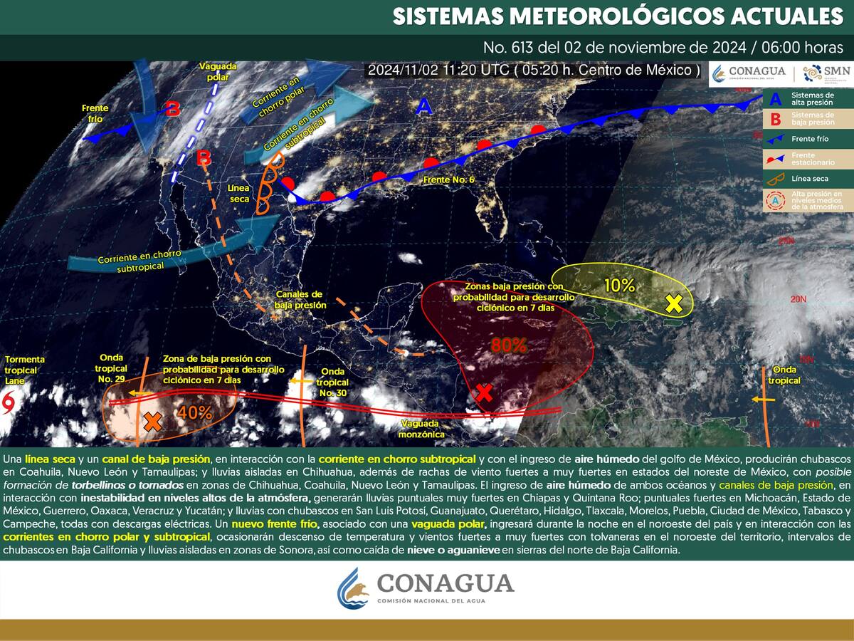 CIUDAD DE MÉXICO — Para este sábado 2 de noviembre se prevén una línea seca sobre Chihuahua y Coahuila y un canal de baja presión sobre el Noreste del País, en interacción con la corriente en chorro subtropical y con el ingreso de aire húmedo del golfo de México, producirán chubascos en Coahuila, Nuevo León y Tamaulipas.